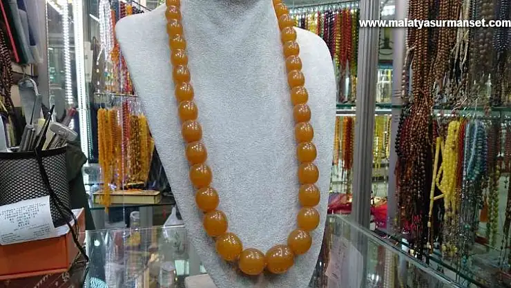 Elazığ'da bir tespih dükkanında bulunan 200 yıllık damla kehribardan yapılan at gerdanlığı 50 bin liraya alıcısını bekliyor.