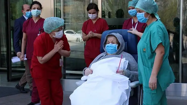 Ankara'da korona virüse yakalanan 80 ve 89 yaşlarındaki çift, 13 günlük tedavilerinin ardından virüsü yenerek taburcu edildi. Hastane çalışanları, çifti alkışlarla uğurladı.
