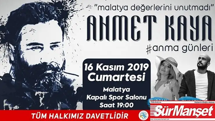 Arguvan Belediyesinden alınan bilgilere göre 16 Kasım 2019 Cumartesi günü Malatya’da Kapalı Spor Salonunda Ahmet Kaya’yı anma etkinliği düzenlenecek. Akşam 19.00’da başlayacak olan etkinlikte sahne alacak Nurcan Selçuk ve Eymen, Ahmet Kaya’nın unutulmaz eserlerini seslendirecek.