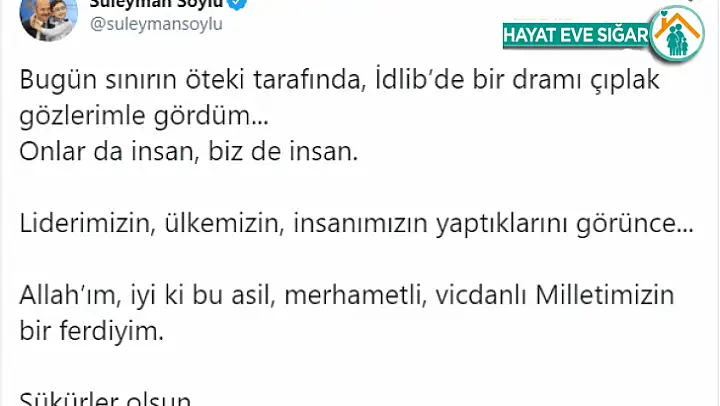 'Bugün sınırın öteki tarafında, İdlib'de bir dramı çıplak gözlerimle gördüm... Onlar da insan, biz de insan. Liderimizin, ülkemizin, insanımızın yaptıklarını görünce... Allah'ım, iyi ki bu asil, merhametli, vicdanlı Milletimizin bir ferdiyim. Şükürler olsun...'