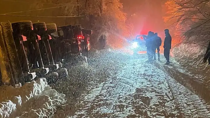 Adıyaman'ın Çelikhan ilçesinde CNG Tankeri yoğun kar yağışında kayarak şarampole devrildi.