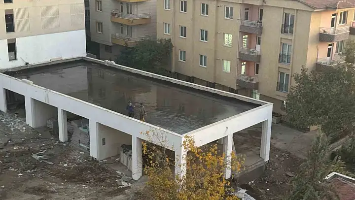 Malatya'nın Yeşilyurt ilçesinde rezerv alan olarak belirlenen bölgede inşaatı süren tek katlı iş yeri, yağışların ardından suyla dolarak adeta havuza döndü. Biriken suyun tahliyesi için duvara delik açılırken, iki işçi suyu boşaltmaya çalıştı. O anlar vatandaş kamerasına yansıdı.