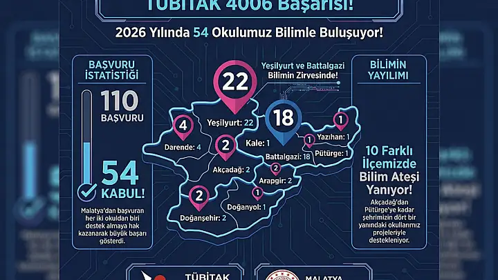 TÜBİTAK tarafından genç beyinleri düşünmeye, gözlem yapmaya ve merak etmeye teşvik etmek amacıyla düzenlenen 4006 Bilim Fuarları Programı'nın sonuçları açıklandı. Malatya, başvuru yapan okulların kabul oranındaki yüksek başarıyla dikkatleri üzerine çekti.