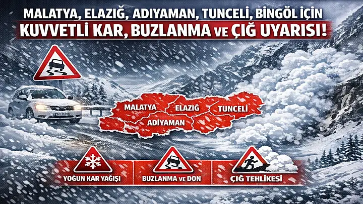 Meteoroloji, Elazığ, Malatya, Tunceli, Bingöl ve Adıyaman çevreleri için kuvvetli kar yağışı, buzlanma, don ve çığ tehlikesine karşı uyardı. Yüksek kesimlerde kar yağışının zaman zaman etkisini artırması bekleniyor.