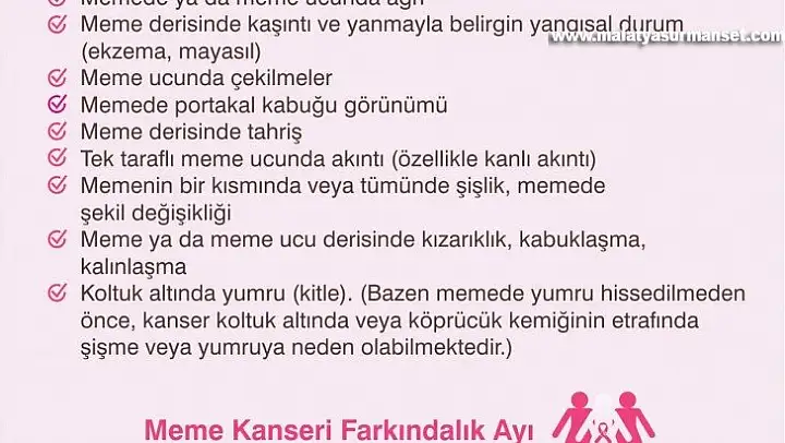 Meme kanseri farkındalık ayı olan Ekim'in sonuna yaklaşılırken, Malatya İl Sağlık Müdürlüğü meme kanseri konusunda uyarı yaptı. Malatya İl Sağlık Müdürlüğü tarafından yapılan yazılı açıklamada, 'Meme kanserinin en sık rastlanan belirtisi, memede ağrısız, zamanla büyüyen bir yumrunun (kitlenin) ele gelmesi, hissedilmesidir. Meme kanserini olabildiğince erken yakalamak, başarılı bir tedavi şansı sunar' cümlelerine yer verildi.