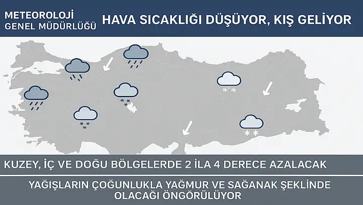 Kuzey, iç ve doğu kesimlerde hava sıcaklığı 2 ila 4 derece düşecek, yükseklerde kar, düşük rakımlarda karla karışık yağmur görülecek.