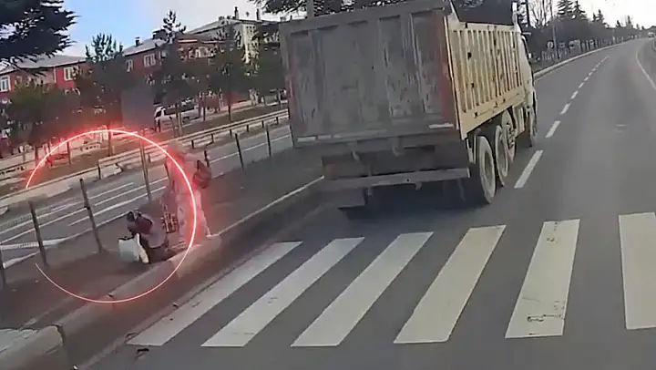 Bakan Yerlikaya'nın paylaştığı görüntülerde, yaya geçidinden geçmeye çalışan yayalara sağ şeritteki araç yol verirken, sol şeritten hızla gelen bir kamyonun çarpma tehlikesi oluşturduğu görüldü.