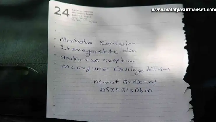 Elazığ'da önceki gün eve gitmek isterken park halindeki bir araca çarpan Mehmet Bektaş isimli vatandaş, sağa çekerek çarptığı aracı kontrol etti ve sağ arka kapının içeri gömüldüğünü fark etti. Bir süre orada bekleyen Bektaş kimseyi göremeyince çarptığı aracın ön camına İstemeyerek araca çarptım masrafını karşılayabilirim notunu bıraktı. Evine gitmek için arabasına binen Ömer Demir ise camdaki notu görünce İnsanlık ölmemiş dedi.