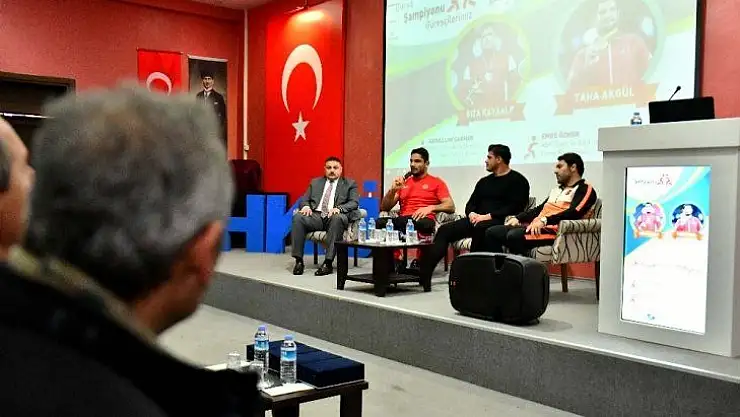 Söyleşide 4 kez dünya, 9 kez Avrupa şampiyonu olan Rıza Kayaalp ile 1 olimpiyat, 2 dünya ve 7 kez de Avrupa şampiyonluğu bulunan Taha Akgül başarı hikayelerini öğrencilerle paylaştılar.