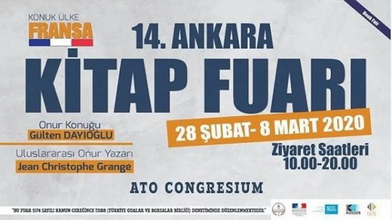 14. Ankara Kitap Fuarı, ATO Congresium’da kapılarını başkentli okuyuculara açıyor. Fuar, kitapseverleri 28 Şubat-8 Mart tarihleri arasında yurt içi ve yurt dışından pek çok yazarla buluşturacak. Fuara Fransa konuk ülke, Gülten Dayıoğlu onur konuğu, Jean C. Grange ise uluslararası onur yazarı olarak katılacak.