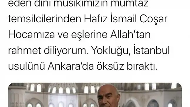 Adalet Bakanı Abdulhamit Gül, Doğumla okunan ezandan ölümle okunan salaya kadar hayatımıza eşlik eden dini musikimizin mümtaz temsilcilerinden Hafız İsmail Coşar hocamıza ve eşlerine Allah'tan rahmet diliyorum dedi.