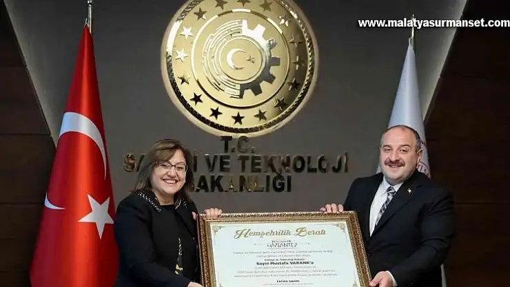 Gaziantep Büyükşehir Belediye Başkanı Fatma Şahin, sanayi ve teknoloji şehri Gaziantep'e verdiği destek ve katkılardan dolayı Sanayi ve Teknoloji Bakanı Mustafa Varank'a, Fahri Hemşehrilik Payesi ve Beratı verdi.