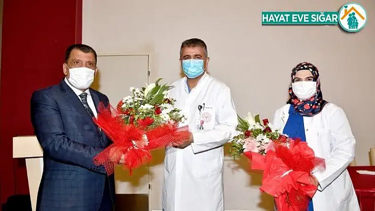 Konuşmaların ardından Başkan Gürkan, Eğitim ve Araştırma Hastanesi Başhekim Prof. Dr. Erdal Aktürk’e, hemşirelere ve sağlık çalışanlarına çiçek ve hediye takdiminde bulundu.