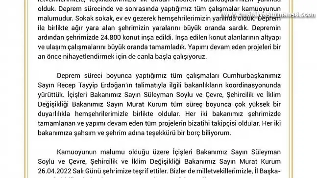Elazığ Belediye Başkanı Şahin Şerifoğulları sosyal medyadan yaptığı açıklamada, “Elazığ Belediye Başkanı olarak 24 Ocak depremin gerçekleştiği ilk andan itibaren depremin yaralarını sarmak için sahada yerimizi aldık. Bakanlarımızla, milletvekillerimizle, teşkilatlarımızla ilk andan itibaren vatandaşlarımızın yanında olduk. Deprem sürecinde ve sonrasında yaptığımız tüm çalışmalar kamuoyunun malumudur. Sokak sokak, ev ev gezerek hemşerilerimizin yanında olduk. Deprem ile birlikte ağır yara alan şehrimizin yaralarını büyük oranda sardık. Depremin ardından şehrimizde 24 bin 800 konut inşa edildi. İnşa edilen konut alanlarının altyapı ve ulaşım çalışmalarını büyük oranda tamamladık. Yapımı devam eden projeleri bir an önce nihayetlendirmek için de canla başla çalışıyoruz. Deprem süreci boyunca yaptığımız tüm çalışmaları Cumhurbaşkanımız Recep Tayyip Erdoğan’ın talimatıyla ilgili bakanlıkların koordinasyonunda yürüttük. İçişleri Bakanımız Süleyman Soylu ve Çevre, Şehircilik ve İklim Değişikliği Bakanımız Murat Kurum tüm süreç boyunca çok yüksek bir duyarlılıkla hemşehrilerimizle birlikte oldular. Her iki bakanımız şehrimizde tamamlanan ve yapımı devam eden tüm projelerin bizatihi takipçisi oldu. Her iki bakanımıza şahsım ve şehrim adına teşekkürü bir borç biliyorum. Kamuoyunun malumu olduğu üzere İçişleri Bakanımız Süleyman Soylu ve Çevre, Şehircilik ve İklim Değişikliği Bakanımız Murat Kurum 26.04.2022 Salı günü şehrimize teşrif etti. Bizler de milletvekillerimizle, il başkanımızla birlikte bakanlarımızın programlarına refakat ettik. Ziyaretlerde her iki bakanımız da hemşerilerimizin talepleri ile yakından ilgilendiler. Mustafapaşa mahallemizde vatandaşlarımızın yoğun katılımıyla gerçekleştirdiğimiz programda yaşanılan ve kamuoyuna yansıyan görüntülerle ilgili olarak özellikle CHP İl Başkanlığının yapmış olduğu açıklamalar gerçeklikten ve iyi niyetten uzak açıklamalardır" dedi.