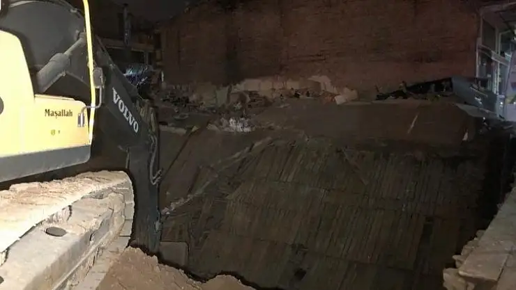 Köpeği, enkaz altında kurtarma çalışması başlatan itfaiye ekipleri olası bir tehlikeye karşı çöken dükkanın etrafında güvenlik önlemi aldı.