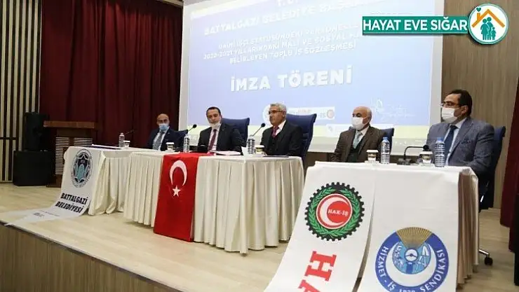 Battalgazi Belediyesi ve HAK-İŞ Konfederasyonuna bağlı Hizmet-İş sendikası arasında Toplu İş Sözleşmesi gerçekleştirildi. Toplu iş sözleşmesi Battalgazi Belediyesi Konferans Salonu’nda düzenlenen imza töreni ile Battalgazi Belediye Başkanı Osman Güder ve Hak-İş ve Hizmet-İş Sendikası Malatya Şube Başkanı Bünyamin Geleri arasında pandemi kuralları dikkate alınarak imzalandı.