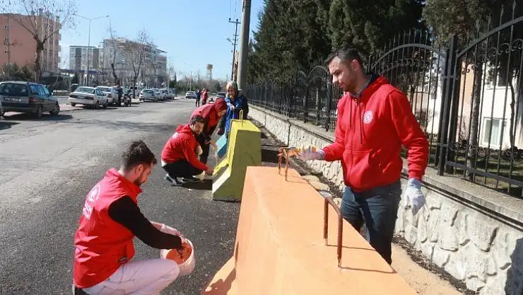 Adıyaman Gençlik Merkezinden gençler, kurumların önünde bulunan beton bariyerleri renklendirip tarihi motifler çiziyor.