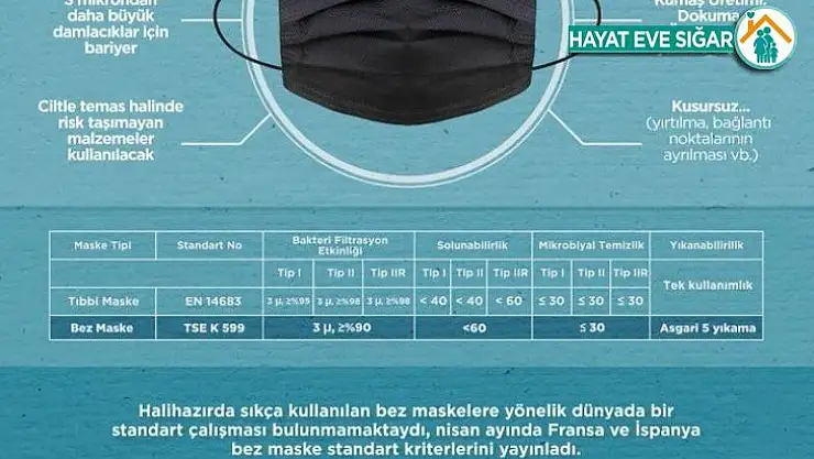 Cumhurbaşkanı Erdoğan’ın duyurduğu ve virüse karşı korumada, kullanılan hijyenik maskelerin sahip olması gereken özellikleri içeren kriterler belirlendi. Marketler, alışveriş merkezleri gibi yoğun, kapalı alanları ziyaret ederken veya toplu taşıma araçlarını kullanırken takılma zorunluluğu bulunan bez maskeye böylece Türk Standardları Enstitüsü tarafından standart getirilmiş oldu. Hazırlanan standartla maskenin özellikleri, üretimi, tasarımı, temizleme, yıkama, kurutma ve bağlantı durumlarının nasıl olması gerektiği ayrıntılı olarak ortaya konuldu. Standart, TSE’nin internet sitesine yüklenerek erişime açıldı.