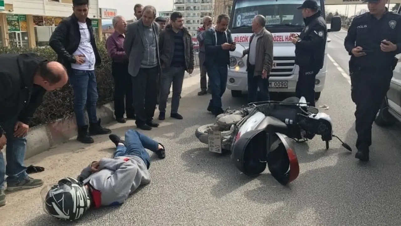 Alınan bilgiye göre, Bilecik merkez Abdülhamidhan Bulvarından Küçük Sanayi İstikametine seyir halindeki Adem Gücen yönetimindeki 11 M 0090 minibüs ile Park 2 Sokaktan bulvara çıkış yapan Serkan Akkaş idaresindeki 11 DM 844 plakalı motosiklet çarpıştı. Çarpışmanın etkisi ile savrulan motosiklet sürücüsü Serkan Akkaş ile minibüste yolcu olarak bulunan Sebiha Eröz (51) yaralandı. Yaralılar olay yerinde 112 Acil Servis ekiplerinde olay yerinde yapılan ilk müdahalenin ardından yaralılar Bilecik Devlet Hastanesine kaldırıldı.