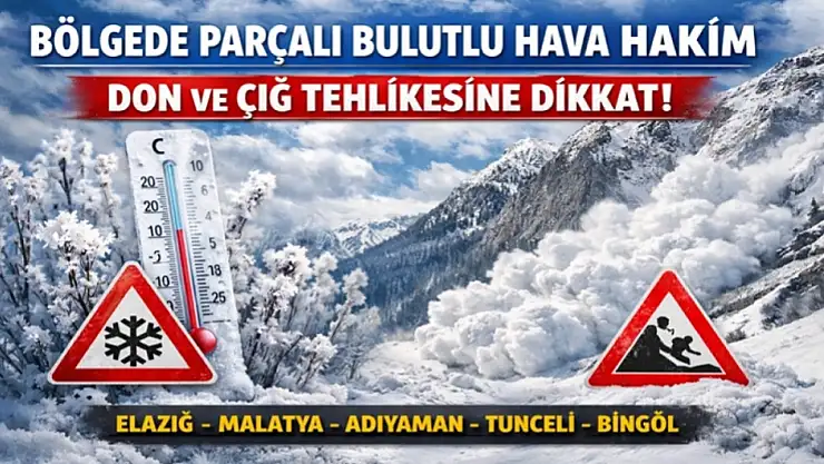 Elazığ, Malatya, Tunceli, Bingöl ve Adıyaman’ın kuzey kesimlerinde hava parçalı ve çok bulutlu geçecek. Gece ve sabah saatlerinde yüksek kesimlerde buzlanma, don, sis ve pus beklenirken; eğimli ve kar örtüsünün yoğun olduğu alanlar için çığ uyarısı yapıldı.