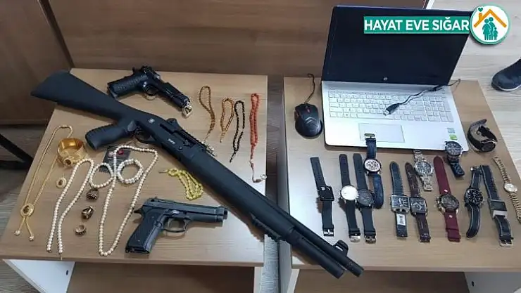 Hırsızlık Büro Amirliği Ekipleri’nin yaptığı aramalarda ele geçirilen 1 adet notebook, 13 adet değişik markalarda saat, 12 adet gümüş yüzük, 5 adet tespih, çeşitli takı malzemeleri, altın renginde imitasyon takı seti, 1 adet ruhsatsız tüfek, 2 adet kurusıkı tabanca ele geçirildi.