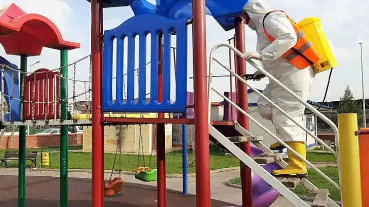 Diyarbakır'ın Bağlar İlçe Belediyesi, 60 kişilik ekip ve 8 buharlı araçla sürdürdüğü dezenfekte çalışmalarında yaşam alanlarına dokunuyor. Bu kapsamda çocuk oyun parkları ve buralardaki oyun grupları dezenfekte edildi.