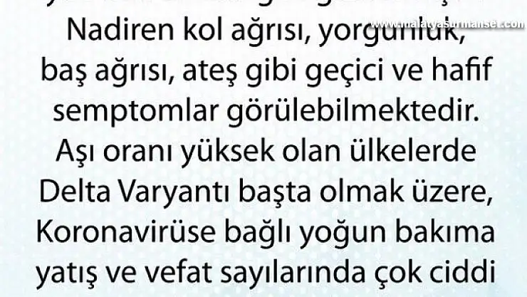 Kurban Bayramı öncesi vaka sayılarının azalmasıyla kısıtlamalar kaldırılırken, vakalar bayram sonrası tekrar artış gösterdi. Delta varyantının etkisiyle yayılmaya devam eden korona virüs pandemisinin önlenmesi için aşı konusunda bir kez daha uyarı yapıldı. Malatya İl Sağlık Müdürü Prof. Dr. Recep Bentli, sosyal medya hesabında yaptığı açıklamada, Covid-19 salgınını bitirecek tek silahın aşı olduğunu vurguladı. Bentli, “Klinik çalışmalar ve mevcut uygulamalar aşı sonrası ciddi bir yan etki olmadığını göstermiştir. Nadiren kol ağrısı, yorgunluk, baş ağrısı, ateş gibi geçici ve hafif semptomlar görülebilmektedir. Aşı oranı yüksek olan ülkelerde Delta Varyantı başta olmak üzere, korona virüse bağlı yoğun bakıma yatış ve vefat sayılarında çok ciddi azalma görülmüştür. Aşı, korona virüs hastalığının ağır geçmesini önlemektedir” ifadelerine yer verdi.