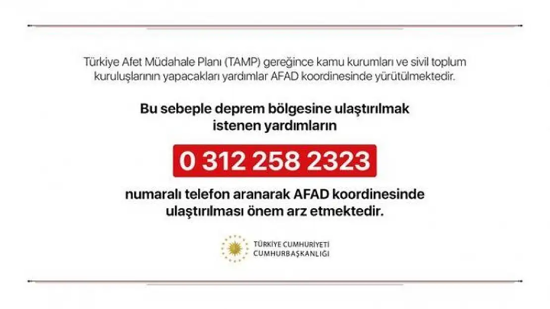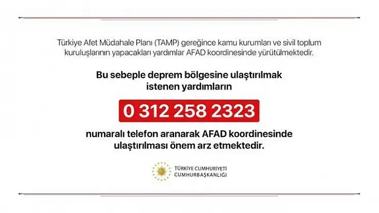 Cumhurbaşkanlığı, resmi Twitter hesabından yaptığı açıklamada, Türkiye Afet Müdahale Planı (TAMP) gereğince kamu kurumları ve sivil yardım kuruluşlarının yapacakları yardımlar AFAD koordinesinde yürütülmektedir. Bu sebeple deprem bölgesine ulaştırılmak istenen yardımların ’0 312 258 23 23’ numaralı telefon aranarak AFAD koordinesinde ulaştırılması önem arz etmektedir" ifadeleri kullanıldı.
