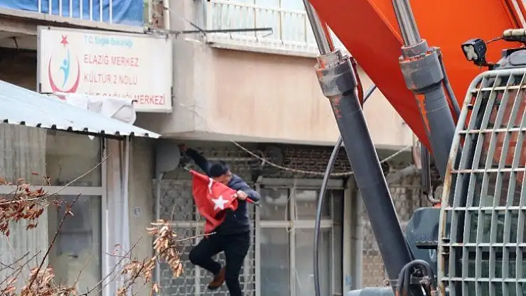 Elazığ'da yıkım öncesi operatörün bayrak hassasiyeti