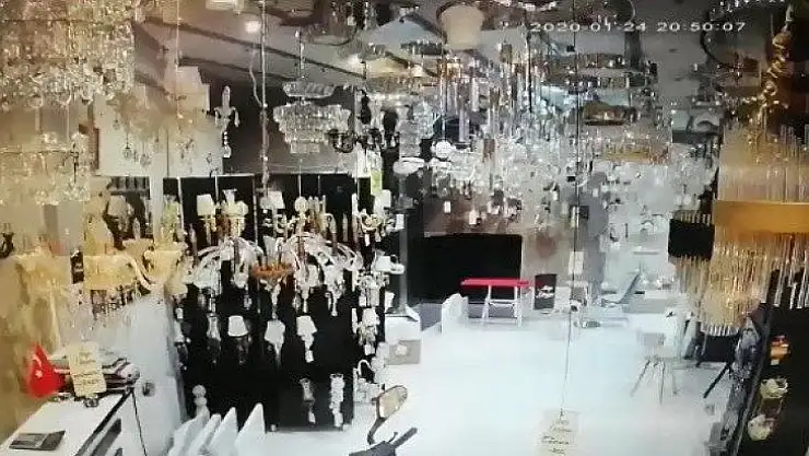 Elazığ Sivrice merkez üssü olan 6.8 büyüklüğündeki depremin şiddetini en net şekilde gösterenlerden biri avize satışı yapan bir iş yerinin güvenlik kamerası oldu.