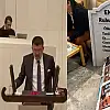 CHP Malatya Milletvekili Veli Ağbaba, TBMM'de görüşülen en düşük emekli aylığını 20 bin liraya çıkaran kanun teklifi görüşülürken kürsüye kartondan yapılmış tabut ve 'Emeklinin Ruhuna Fatiha' yazılı karton mezar taşıyla çıktı.