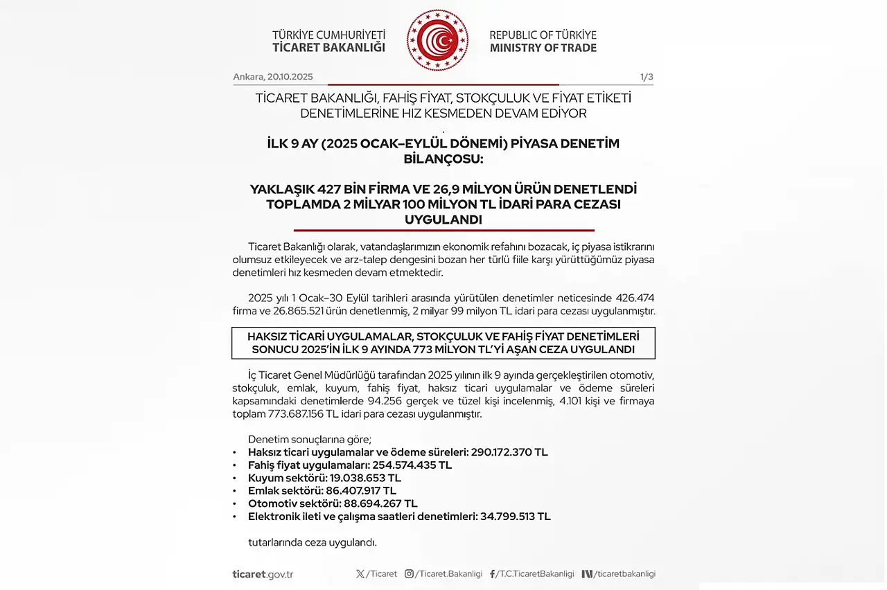 Bakanlık tarafından yapılan açıklamaya göre, 1 Ocak – 30 Eylül 2025 tarihleri arasında 426 bin 474 firma ve 26 milyon 865 bin 521 ürün denetlenirken, bu denetimler sonucunda toplam 2 milyar 99 milyon TL idari para cezası kesildi.