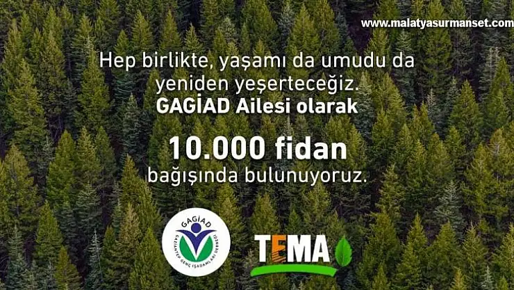 Gaziantep Genç İşadamları Derneği (GAGİAD) yakın zamanda çıkan yangınlar sebebiyle, bölgenin yeniden ağaçlandırılması için TEMA Vakfı'nın başlatmış olduğu 'Yaşamı Yeniden Yeşerteceğiz' kampanyasına 10 bin adet fidan bağışında bulundu.