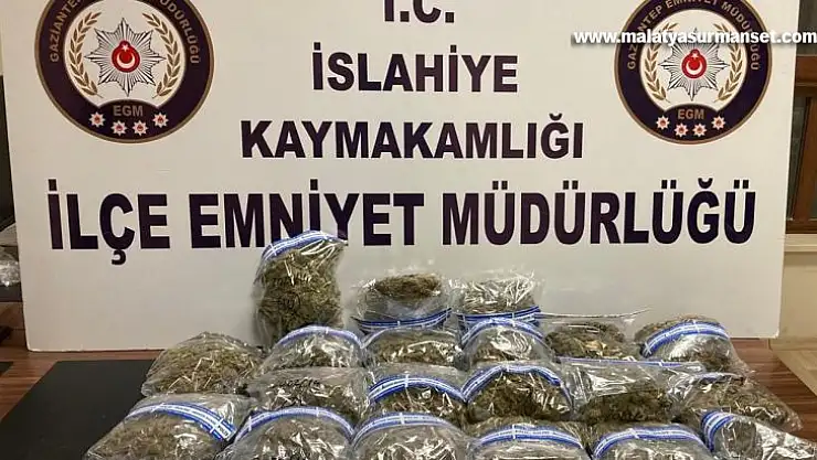 Gaziantep Emniyet Müdürlüğü’ne bağlı Narkotik Suçlarla Mücadele Şube Müdürlüğü İslahiye Narkotik Grup Amirliği ekipleri, Fevzipaşa Mahallesi tren garında Elazığ-Adana seferini yapan trende 2 yolcudan şüphelendi. Cumhuriyet Başsavcılığı koordinesiyle şüpheli 2 yolcunun üzerinde ve yanında bulunan paketlerde arama yapıldı. Yapılan aramalar neticesinde 10 kilo 630 gram esrar ele geçirildi. Şüpheli 2 şahıs gözaltına alındı.
