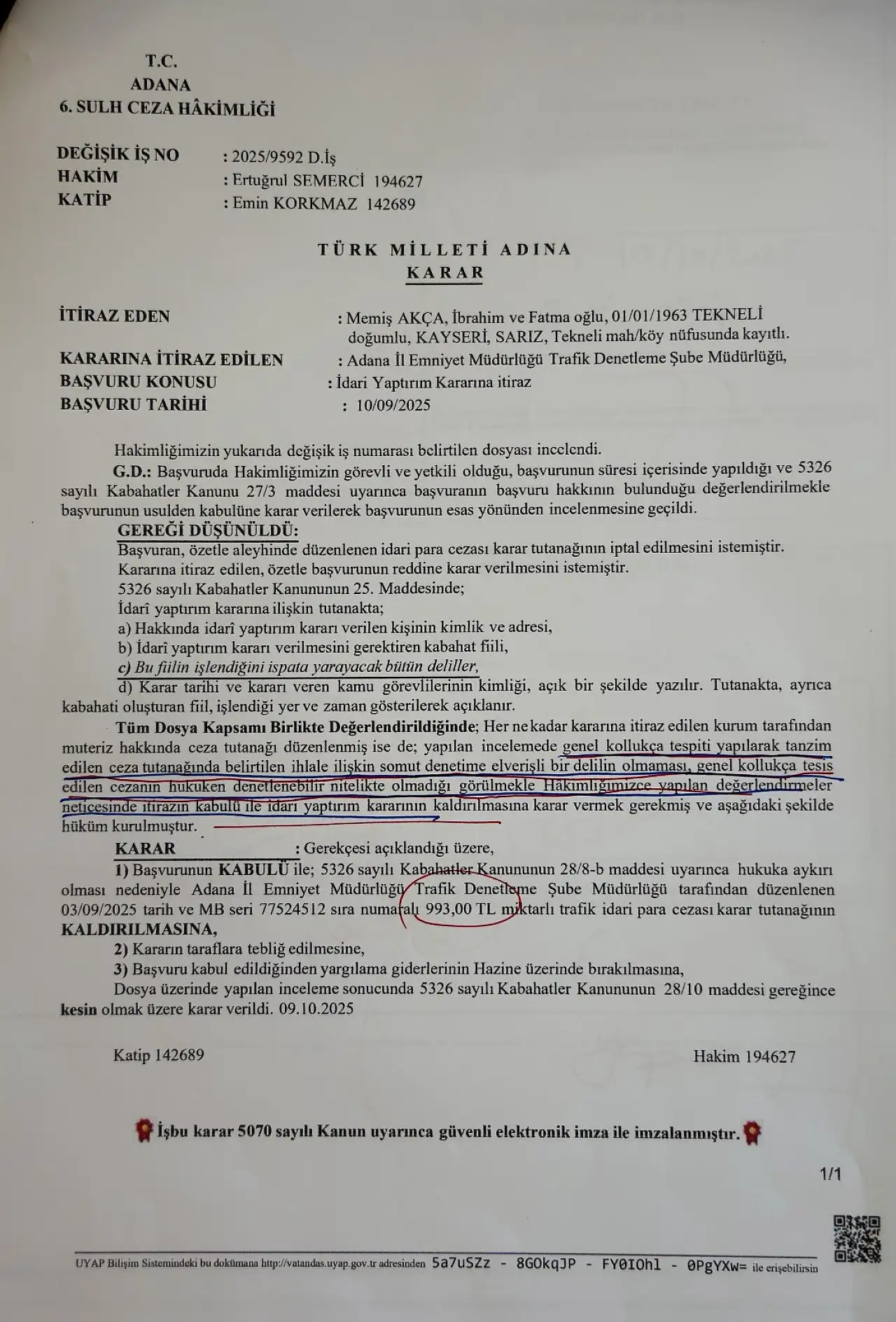 Şehirde yaşayan Memiş Akça geçtiğimiz eylül ayında 01 ETL 38 plakalı otomobiliyle merkez Seyhan ilçesine bağlı Döşeme Mahallesi'nde 'hatalı park' nedeniyle 993 TL idari para cezası yedi. Akça, avukat kızı Nazan Akça Subaşı'ya durumu anlattı. Kızı, tutanağı incelediğinde trafik cezasının trafik polisi olmayan bir polis memuru tarafından kesildiğini tespit etti. Bunun üzerine Avukat Subaşı, babasının adına Adana 6.Sulh Ceza Hakimliği'ne dava açtı. Geçtiğimiz haftalarda görülen davada mahkeme, "Genel kolluk görevlileri trafik cezası kesemez. Trafik cezası, sadece bu işin eğitimini almış trafik polisleri tarafından kesilir" diyerek 993 TL'lik cezayı iptal etti.