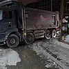 Hafriyat kamyonunun patlayan lastiği iş yerinin camlarını kırdı
