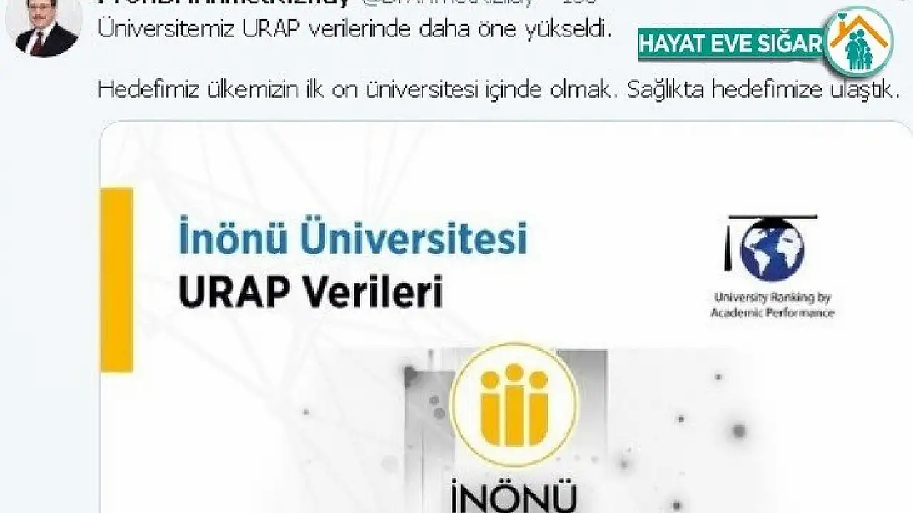 İnönü Üniversitesi Rektörü Prof.Dr. Ahmet Kızılay, URAP’ta devlet üniversiteleri arasında 25.sıraya yükselmelerini değerlendirirken, “ Üniversitemiz University Ranking By Academic Performance(URAP) verilerinde daha öne yükseldi. Hedefimiz ülkemizin ilk on üniversitesi içinde olmak. Sağlıkta hedefimize ulaştık” dedi.