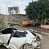 İstinat duvarının altında kalan araçlar demir yığını haline geldi