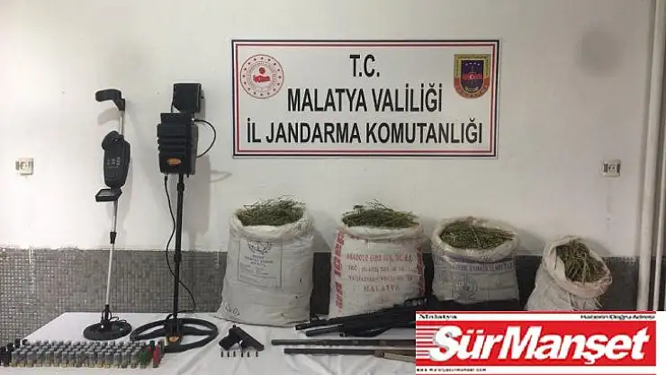 Yapılan aramada 55 kilo esrar, 7.65 mm çapında ruhsatsız tabanca, 1 adet tarihi değeri olduğu değerlendirilen tüfek, 1 adet ruhsatsız otomatik av tüfeği, 1 adet ruhsatsız tek kırma av tüfeği, 6 adet 7.65 mm çapında tabanca mermisi, 94 adet av tüfeği fişeği, 2 adet arama dedektörü ve malzemeleri ele geçirildi.