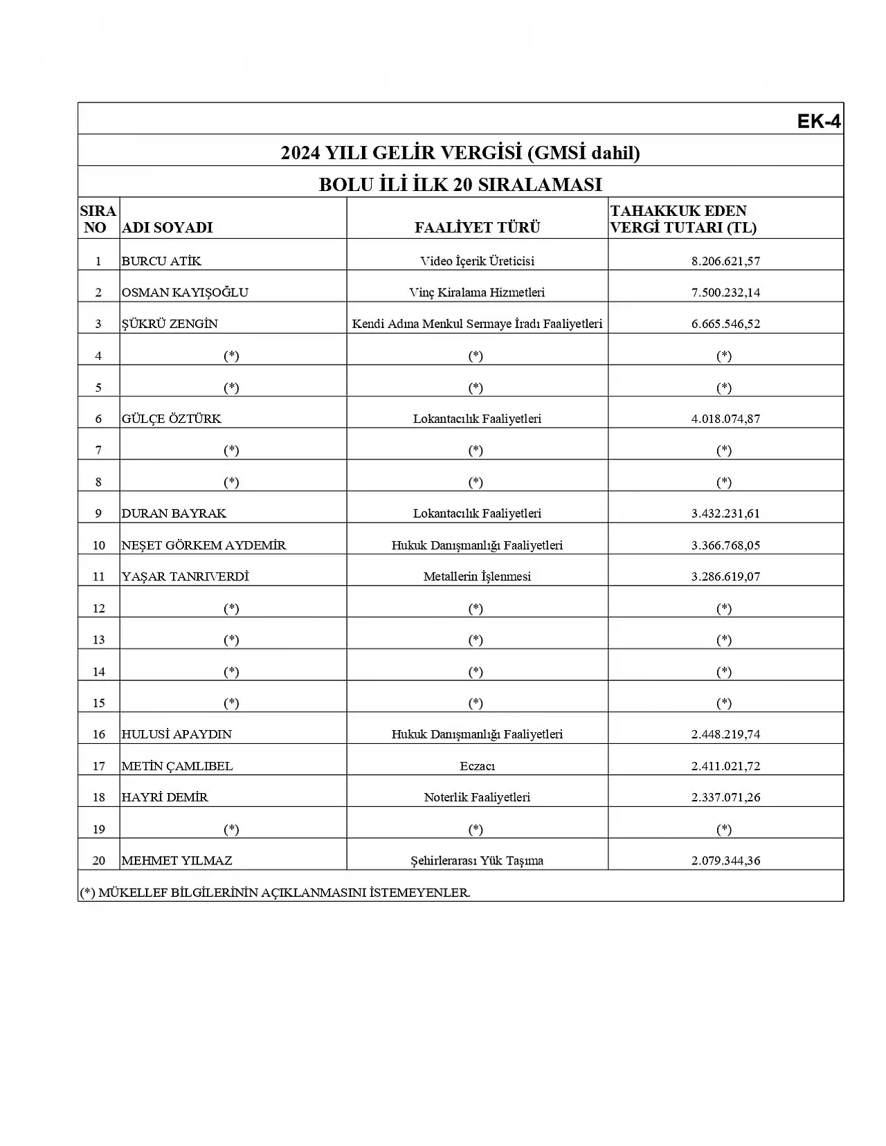 Bolu Vergi Dairesi Başkanlığı, "2024 Yılı Gelir Vergisi Bolu İli İlk 20 Sıralaması" listesini yayımladı. Açıklanan listede, 2024 yılında en fazla vergi ödeyen mükelleflerin isimleri yer aldı. Sosyal medyada milyonlarca kişi tarafından takip edilen kamp içerikleriyle tanınan Burcu Atik'in listenin zirvesinde yer aldığı görüldü. Video içerik üreticisi Burcu Atik, 2024 yılı boyunca 8 milyon 206 bin 621 lira gelir vergisi ödedi. Listenin ikinci sırasında 7 milyon 500 bin liralık vergi ile vinç kiralama hizmeti veren Osman Kayışoğlu, üçüncü sırasında da 6 milyon 665 bin 546 lira vergi ödeyen Şükrü Zengin yer aldı.