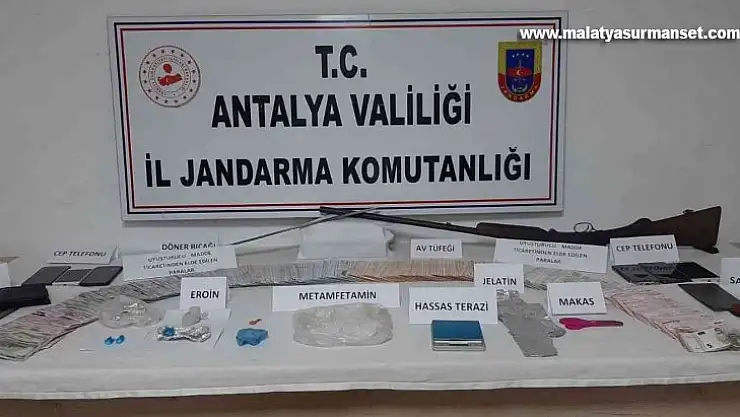 Antalya'da jandarma ekiplerinin ihbar üzerine operasyon düzenlediği evde çok miktarda uyuşturucu madde ile ateşli silah ve döner bıçağı ele geçirildi. Operasyonda 68 bin 510 TL uyuşturucu ticaretinden elde edildiği düşünülen para da bulunurken, olay anında uyuşturucu madde almak isteyen 4 kişi ile birlikte toplamda 8 kişi yakalandı. Yakalanan 8 kişiden 4'ü gözaltına alındı.