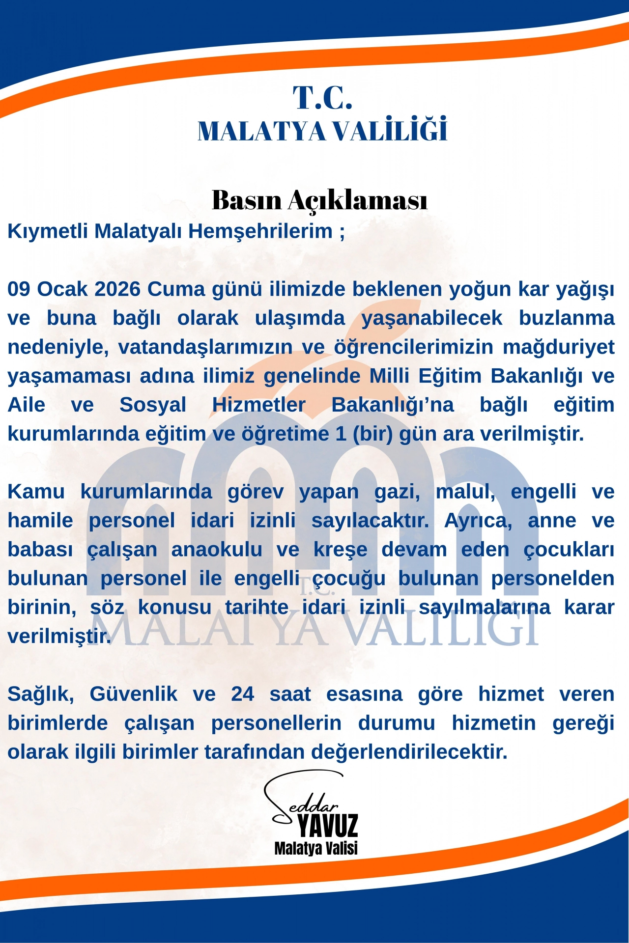 Malatya genelinde 9 Ocak 2026 Cuma günü beklenen yoğun kar yağışı ve buzlanma riskine karşı, Milli Eğitim Bakanlığı ile Aile ve Sosyal Hizmetler Bakanlığı'na bağlı tüm eğitim kurumlarında eğitime bir gün süreyle ara verildi.
