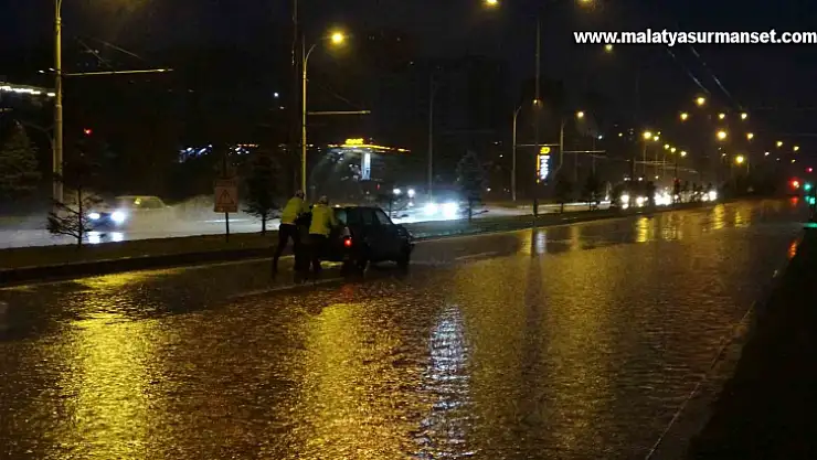 Malatya'da etkili olan sağanak yağış nedeniyle yollar göle dönerken, çok sayıda araç yolda kaldı.