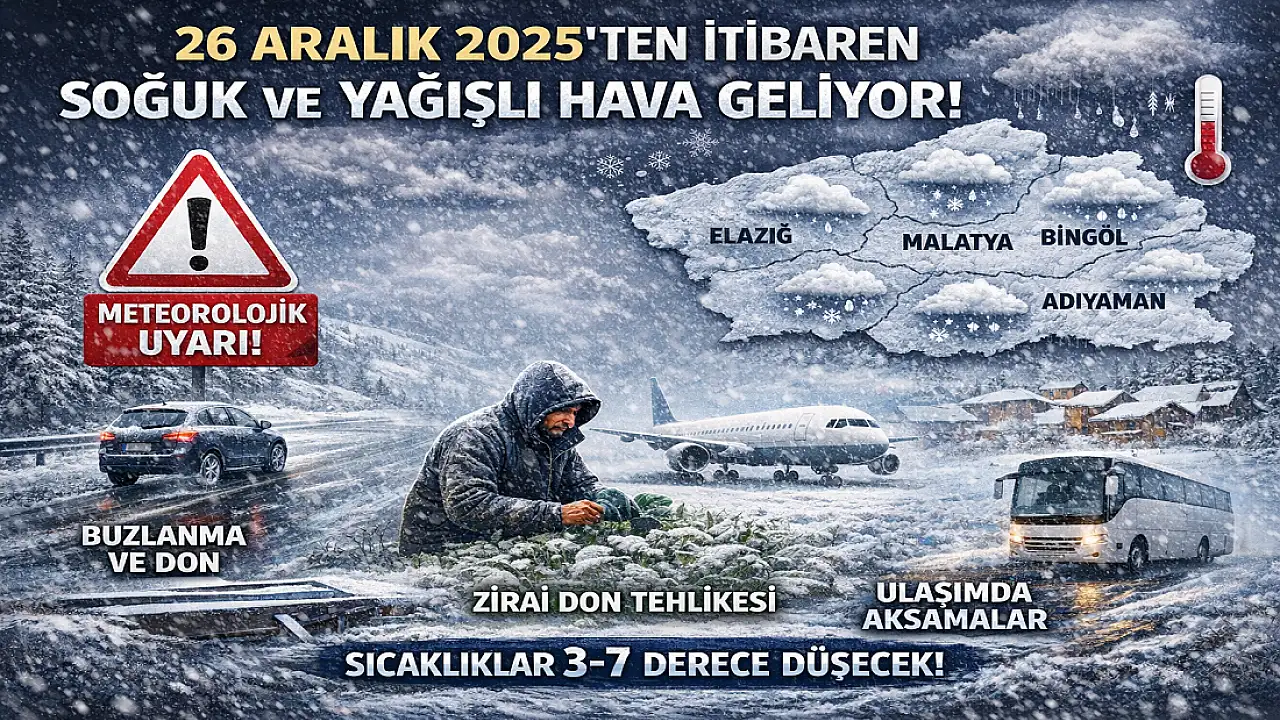 Meteoroloji 13. Bölge Müdürlüğü, Elazığ, Tunceli, Malatya, Bingöl ve Adıyaman için uyarı yaparak, bölgenin cuma gününden itibaren soğuk ve yağışlı havanın etkisine gireceğini bildirdi.
