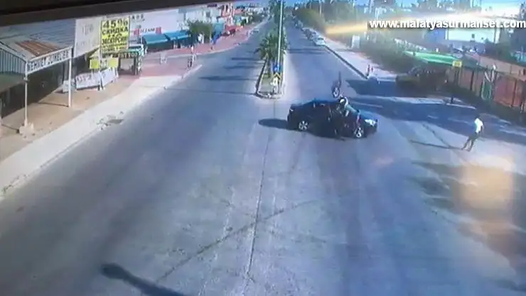 Antalya’nın Manavgat ilçesinde otomobil ile motosikletin çarpışması sonucu meydana gelen trafik kazasında 2 kişi yaralandı. Güvenlik kamerasına yansıyan kazada motosikletin çarpmasıyla birlikte motosiklette yolcu olarak bulunan kişinin otomobilin üzerinden uçtuğu görüldü.