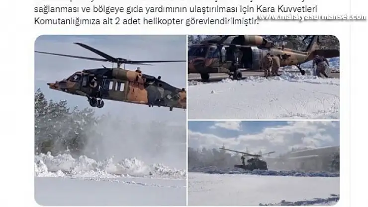 Milli Savunma Bakanlığı (MSB) resmi sosyal medyasından yaptığı açıklamada, “Kar nedeniyle kapanan Adana-Gaziantep otoyolunda mahsur kalan vatandaşlarımız için sıhhi tahliye sağlanması ve bölgeye gıda yardımının ulaştırılması için Kara Kuvvetleri Komutanlığımıza ait 2 adet helikopter görevlendirilmiştir” denildi.