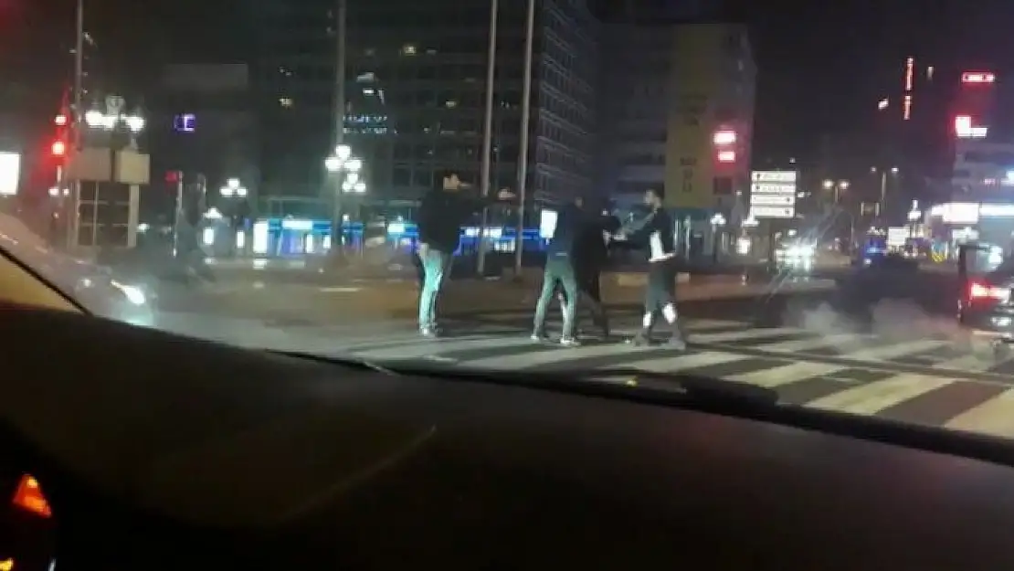 Ankara Kızılay Meydanı'nda kırmızı ışıkta bekleyen otomobilde bulunan 2 kişi, 'yarışalım mı' sorusuna ret cevabı veren diğer araçtaki 2 kişiyle kavga etti. O anlar kameralara yansıdı.