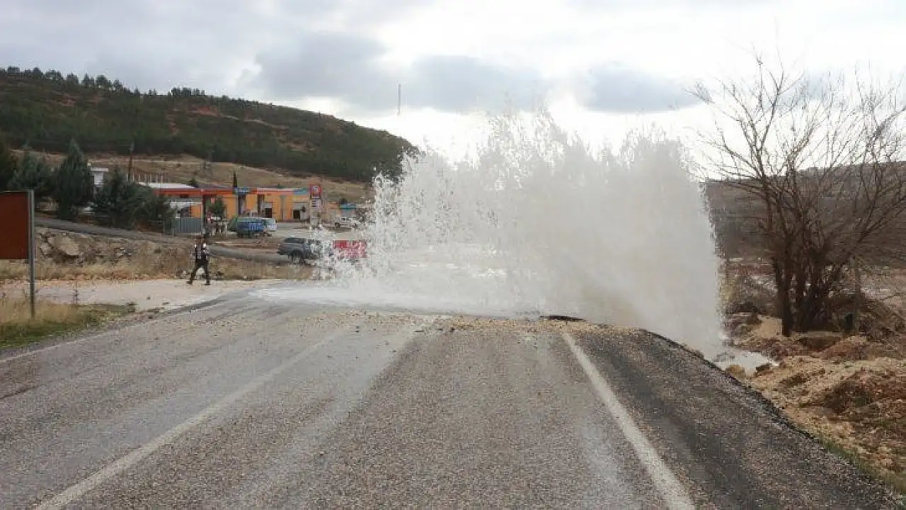 Adıyaman-Malatya Karayolunun altından geçen içme suyu hattında meydana gelen patlama sonrasında yol savaş alanına döndü. Patlayan borudan çıkan sular metrelerce yükseldi.
