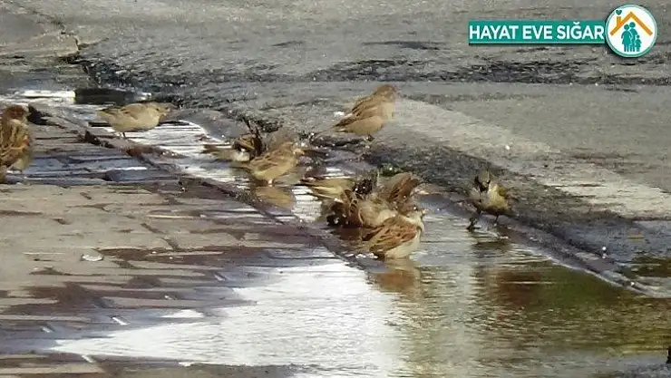 Malatya'da bir sokakta patlayan su borusu ile birlikte akan suyu fırsat bilen serçelerin, suda yıkanmaları kameralara yansıdı.