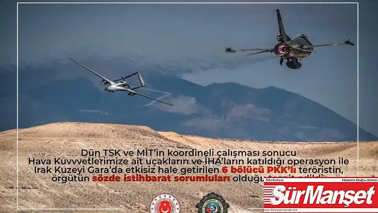 “Dün TSK ve MİT’in koordineli çalışması sonucu Hava Kuvvetlerimize ait uçakların ve İHA’ların katıldığı operasyon ile Irak Kuzeyi Gara’da etkisiz hale getirilen 6 bölücü PKK’lı teröristin, örgütün sözde istihbarat sorumluları olduğu tespit edildi”